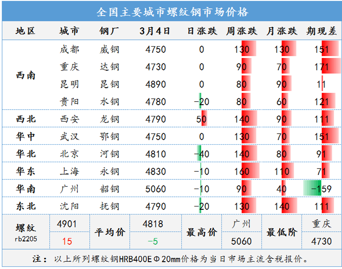 近期俄乌冲突加剧,国际大宗商品价格普涨,带动国内期货市场大幅上涨;铁矿、焦炭等原料价格持续上涨,市场炒作情绪进一步升温;目前正值“两会”敏感时间窗口,市场对利好政策存在预期,加之各地重大项目工程集中开工,对市场信心支撑较强,本周全国钢材市场大幅上涨。总体看,近期国际形势复杂多变,资本市场的频繁波动,对现货引导作用明显。